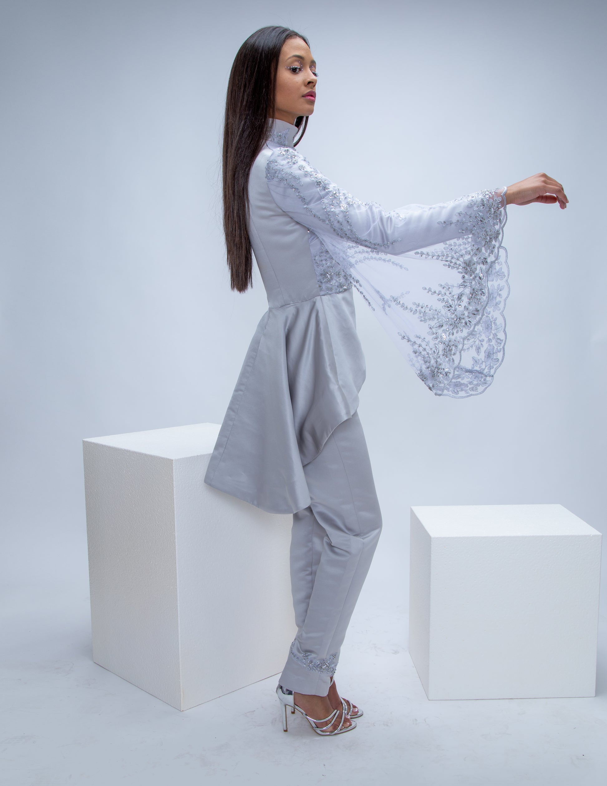 Step into the Serene Luxe Set and feel effortlessly elegant. The exaggerated wide sleeves feature delicate, beaded embellishments that add texture and visual interest while remaining fully opaque. Paired with tailored trousers, this design is thoughtfully created for full coverage and comfort, letting you stand out at any event with effortless sophistication.